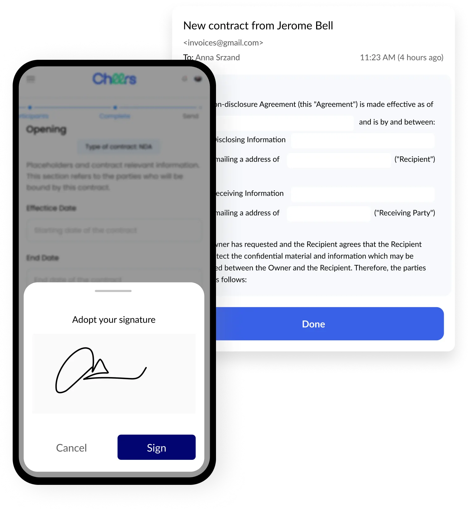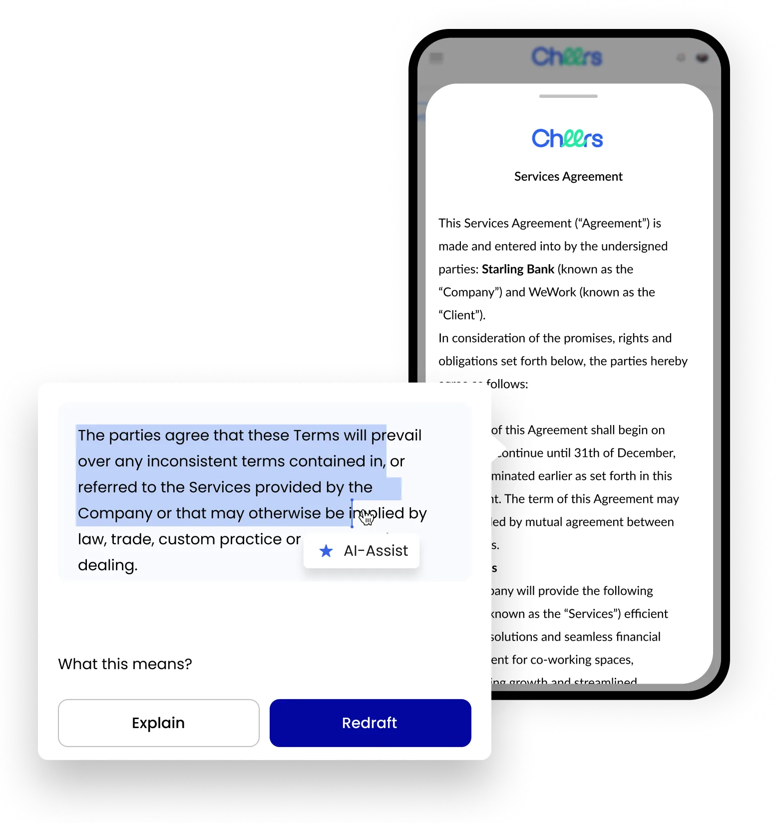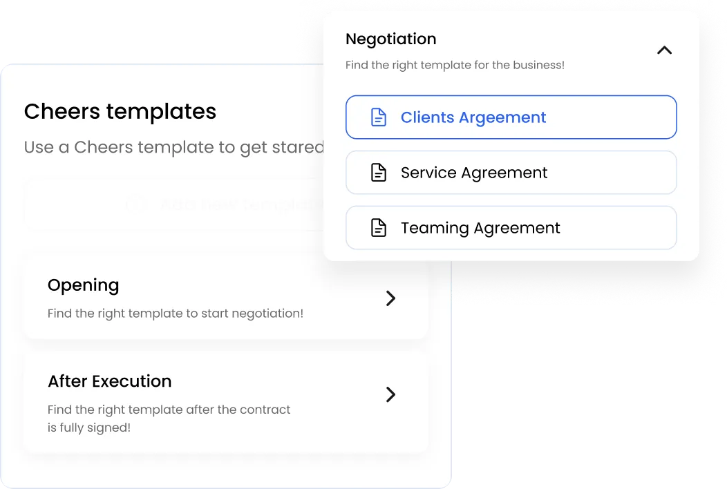 Cheers makes contracts easy—select a template, fill in the details, and sign. Track changes, manage the lifecycle, and optimise with powerful insights. Our AI-powered platform lets you create compliant contracts in minutes.